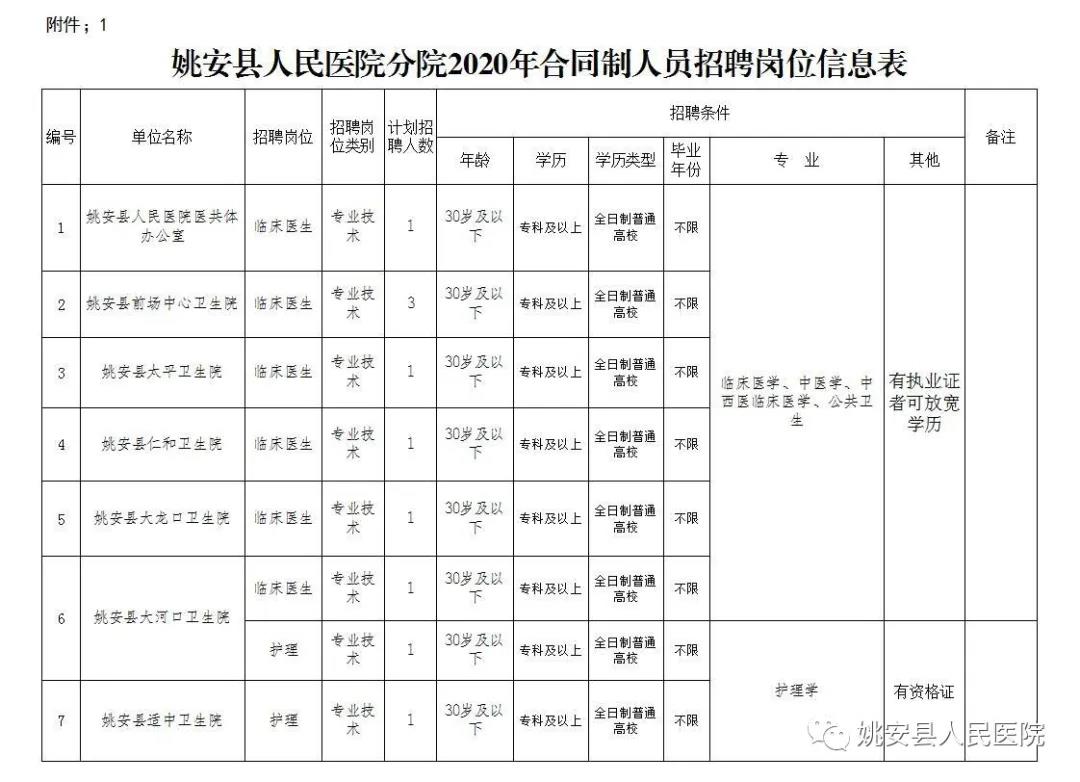 1、《姚安县人民医院分院2020年合同制人员招聘岗位信息表》