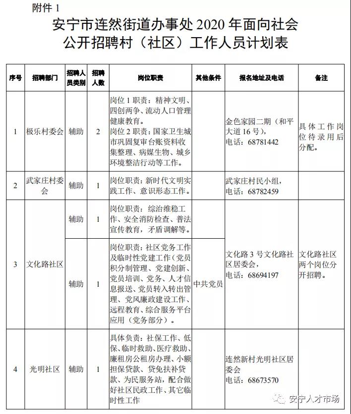 村(社区)辅助性工作人员 6 名。具体招聘职位及要求详见《安宁市连然街道办事处 2020 年面向社会公开招聘村(社区) 工作人员计划表》(以下简称《计划表》,详见附件 1)。