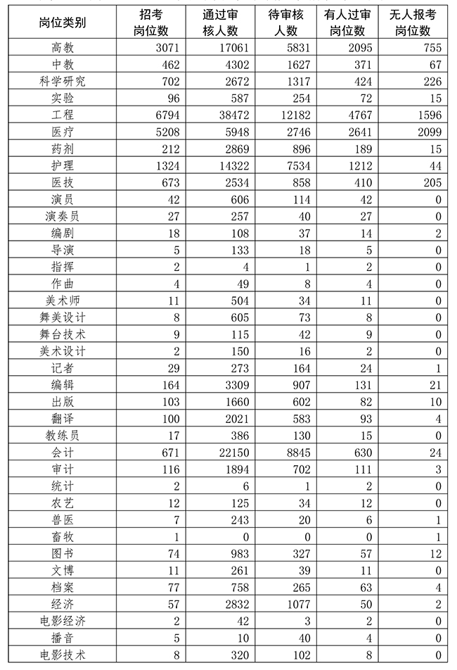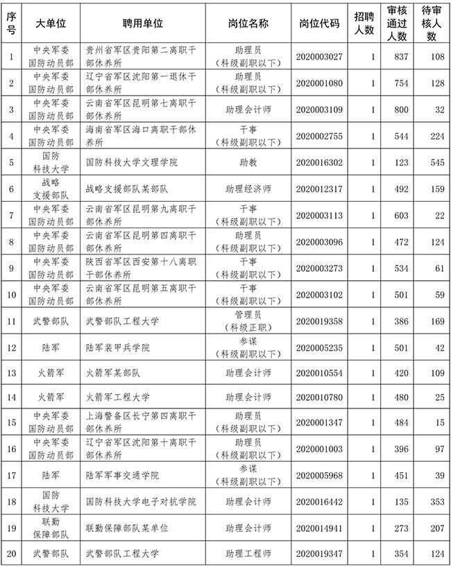 2020年全军面向社会公开招考文职人员(不含博士岗位)网上报名还剩3天时间,截至2020年7月7日17时,有202258名报考人员通过网上报名资格初审,77352名报考人员正在审核。19308个岗位有考生报考、占78.7%,平均报招考比为11.4∶1,最高报招考比为945∶1,有5208个岗位暂时无人报考。网上报名系统将于7月10日18时准时关闭,系统关闭后报考人员不能进行选报岗位、修改信息和提交证明材料等操作。请广大报考人员理性选择报考岗位,抓紧时间提交审核。相关岗位报考情况如下: