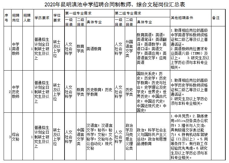 昆明滇池中学2020年招聘合同制教师、综合文秘公告