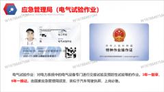 应急管理局电气试验作业证 证书简介 1 电气试验作业:对电力系统中的电气设备专门进行交接试验及预防性试验等的作业。 2 证书性质: 发证机关:应急管理局(原来的安监局),证书3年一审,6年一换证,证书全国通用,上岗必