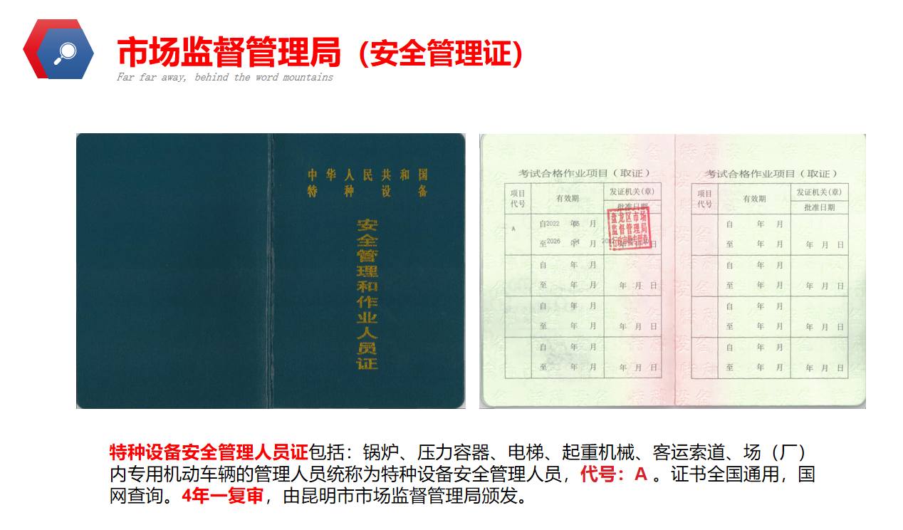 锅炉、压力容器、电梯、起重机械、客运索道、场(厂)内专用机动车辆的管理人员统称为特种设备安全管理人员,代号:A。证书全国通用,国网查询。4年一复审,由昆明市市场监督管理局颁发。