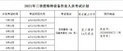 考试工种:特种设备安全管理(A)、起重指挥(Q1)、起重机司机(Q2)、叉车司机(N1)、观光车和观光列车司机(N2)、压力容器作业(R1、R2)、锅炉作业(G1、G2)、电梯修理(T)、气瓶充装(P)等。 第三季度考试计划 :