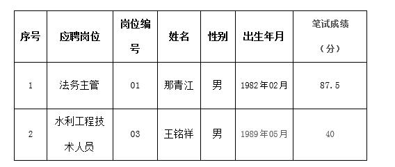 根据《普洱交通建设集团有限责任公司关于公开招聘法务岗位及水利工程技术人员的公告》要求,普洱交通建设集团有限责任公司于2020年6月20日上午9:00-11:00在普洱交通建设集团有限责任公司二号会议室进行公开招聘法务岗位及水利工程技术人员笔试。笔试结束,立即由普洱学院及普洱市水利水电勘测设计研究院组织的阅卷老师进行阅卷,并于2020年6月20日上午11:20提交了密封的笔试成绩。普洱交通建设集团有限责任公司随即召开招聘领导小组工作会议拆封公布了笔试成绩,整个笔试过程由普洱市人民政府国有资产监督管理委员会及普洱交通建设集团有限责任公司纪检部门进行监督,并做了摄像记录。本次公开招聘法务主管岗位及水利工程技术人员岗位各有1人参加笔试。现将笔试成绩及面试有关事项公示如下: