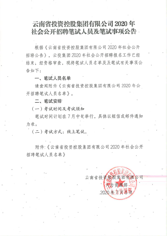 云南省投资控股集团有限公司2020年社会公开招聘笔试人员及笔试事项公告