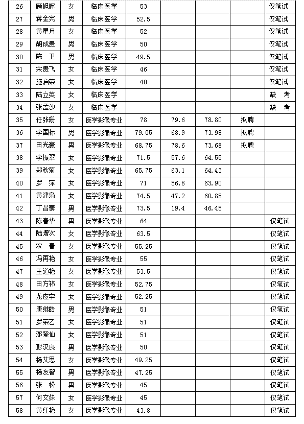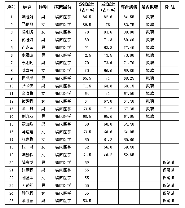 根据《麻栗坡县人民医院2019年公开招聘编外卫生专业技术人员公告》,现将考试成绩及拟聘人员名单公示如下: