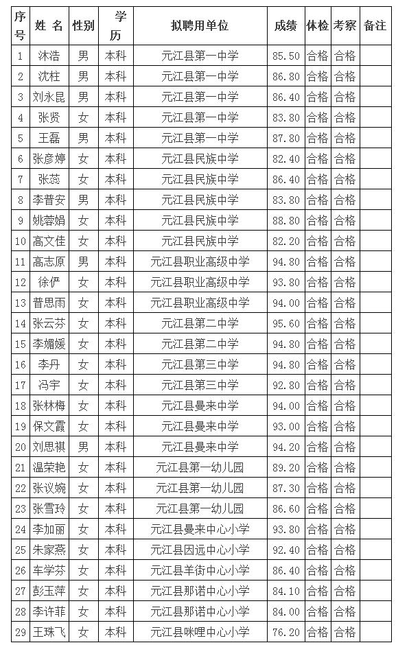 根据《云南省事业单位公开招聘工作人员办法》、《玉溪市关于进一步规范玉溪市事业单位提前招聘工作人员的通知》(玉人社发〔2019〕91号)、《2020年玉溪市元江县教育体育系统提前招聘教师公告》和《元江县事业单位2020年提前招聘工作人员公告》,经发布公告、报名、资格审查、考核、确定聘用人选、签订就业协议、报到及资格复审,并体检、考察合格,确定拟聘用人员29人,现公示如下: